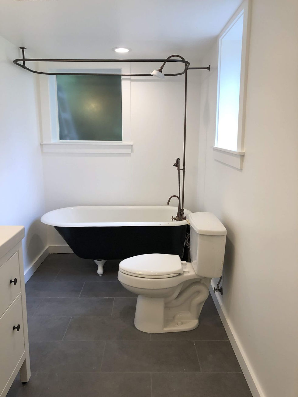 Completely new bathroom: tile, clawfoot tub and shower surround, vanity, lighting, fan, heater, and an additional window.
